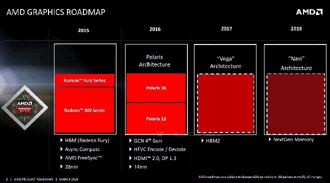 TDP 50W 수준인 폴라리스 11 GPU로는 라데온 300 시리즈의 중상위 모델을 대신하고 그 이상의 모든 모델들은 폴라리스 10 GPU로 커버하겠다는 계획인데 최대 2560개의 스트림 프로세서를 탑재한 것으로 추정되는 폴라리스 10만으로 4096개의 스트림 프로세서가 내장된 퓨리 시리즈를 대신한다니 쉽게 납득할 수 있는 상황은 아니다.