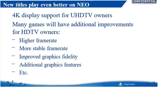 PS NEO는 PS4와 다르게 4K UHDTV를 지원하며, 더욱 안정적인 프레임레이트를 유지할 것이라 알려졌다.