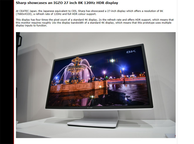 지금은 대만 폭스콘에 인수된 샤프(Sharp)가 일본 최대 선진기술 종합전시회 '시텍 재팬 2016'(CEATEC JAPAN 2016)'에 8K HDR 모니터를 전시해 화제다.