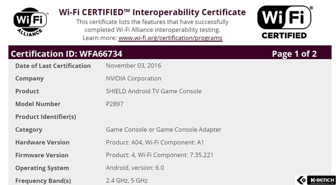 11월 3일 WiFi 인증을 통과한 신형 쉴드 안드로이드 TV는 2.4Ghz와 5Ghz 듀얼 밴드 WiFi를 지원하고 802.11ac 2x2 MIMO 네트워크를 지원해 기존 모델과의 차이점은 발견되지 않았다. 하지만 WiFi 인증 문서를 통해 안드로이드 6.0을 운영체제로 사용한다는 사실이 새롭게 밝혀졌다.