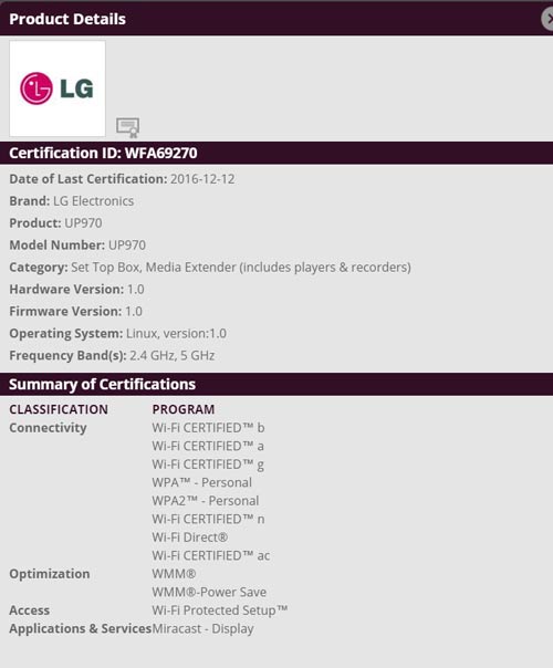 셋탑 박스와 미디어 익스텐더 카테고리로 등장한 UP970은 지난 12일 2.4GHz와 5GHz WiFi 네트워크 검증을 완료한 것으로 나타났는데 이를 보도한 영상기기 관련 매체들은 LG가 개발한 울트라HD 블루레이 플레이어일 가능성이 높다고 분석했다.