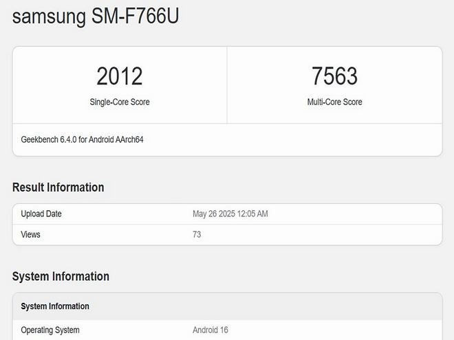갤럭시Z 플립7 프로토타입(SM-F266U)의 긱벤치 점수가 유출되어 싱글코어 2012점, 멀티코어 7563점을 기록했습니다. 이는 스냅드래곤 8 엘리트보다 낮지만, 최종 제품 출시 전까지 성능 향상이 가능합니다.