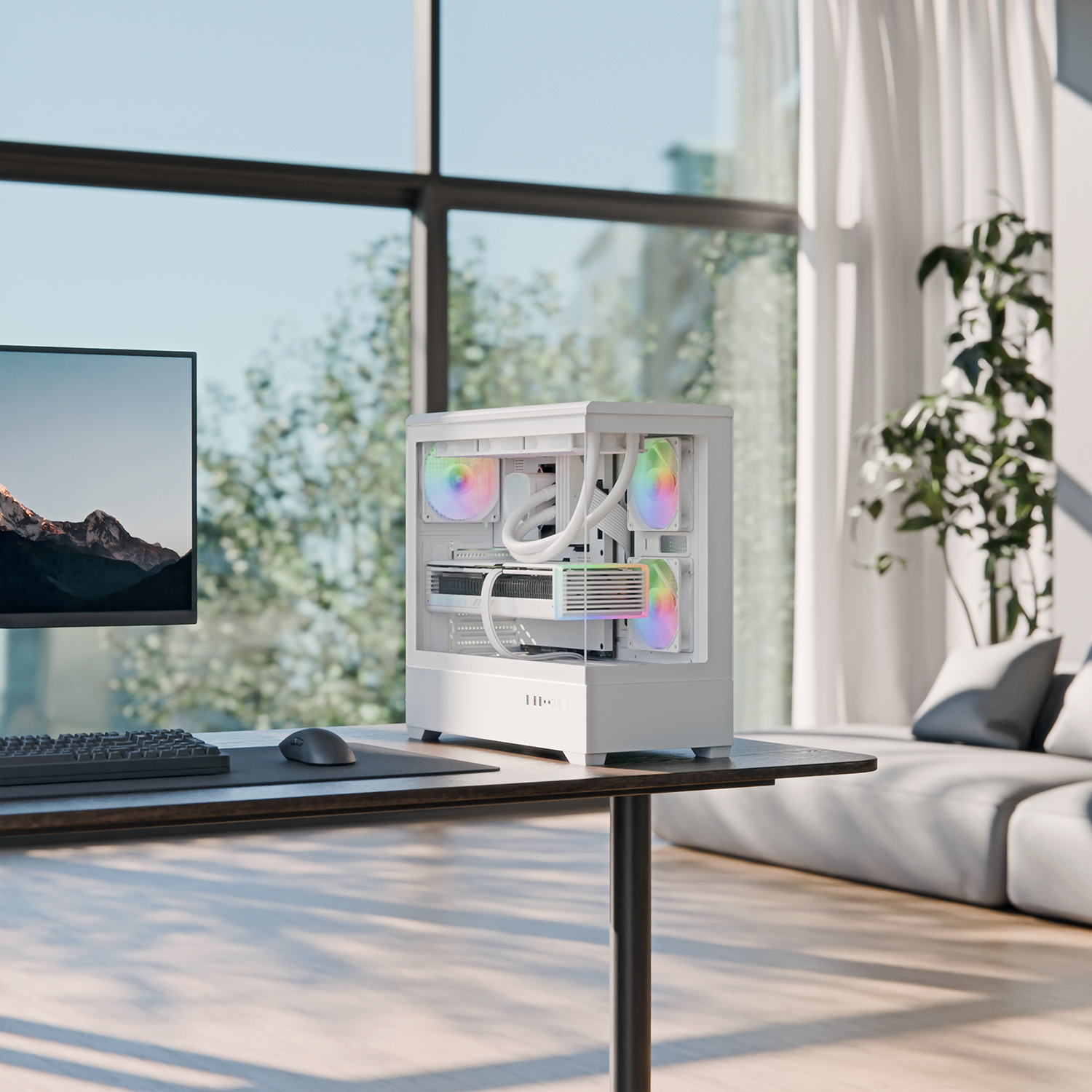 제품 전면과 우측면에는 고강도 강화유리 패널을 적용해서 내부 RGB 조명을 시각적으로 강조하며, 블랙과 화이트도 도색된 미니멀한 외형은 어떤 인테리어에도 자연스럽게 어우러진다.