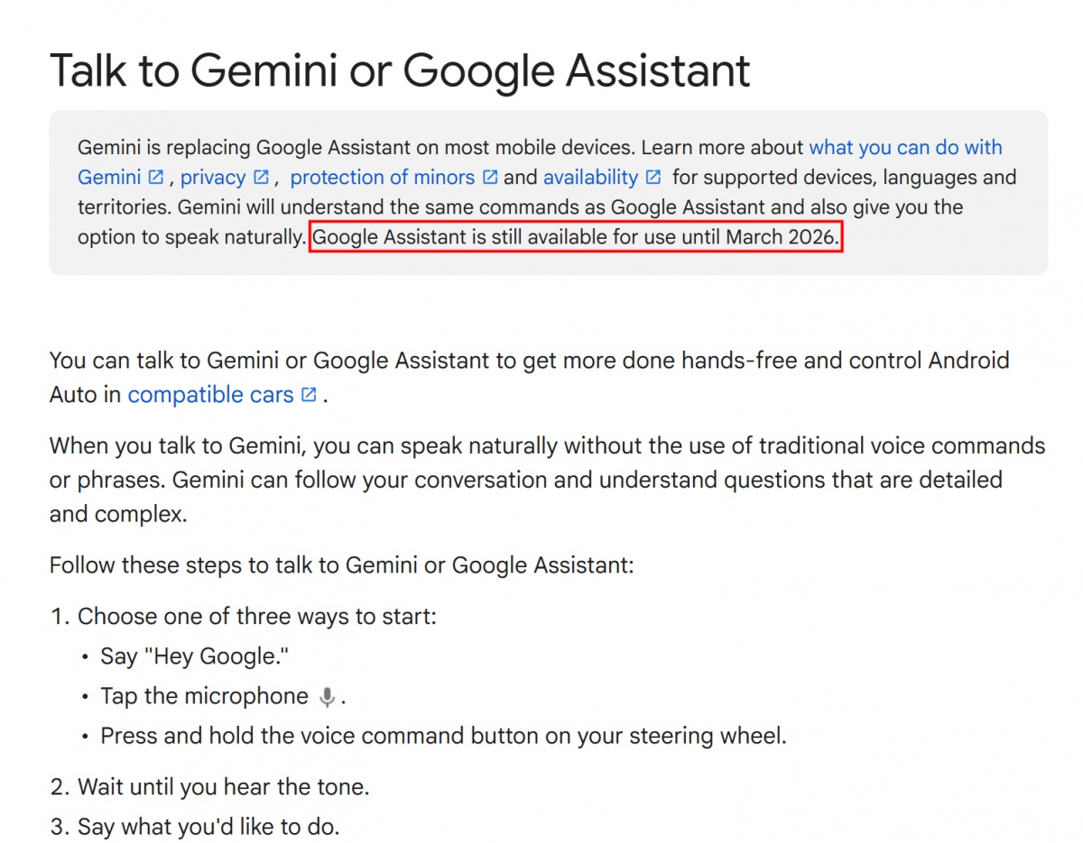 안드로이드 오토 공식 포럼에 따르면 구체적인 종료일은 공개되지 않았지만, 2026년 3월 이후에는 어시스턴트 기능이 모든 기기에서 사라지고 제미나이(Gemini)로 완전히 대체될 예정이다.