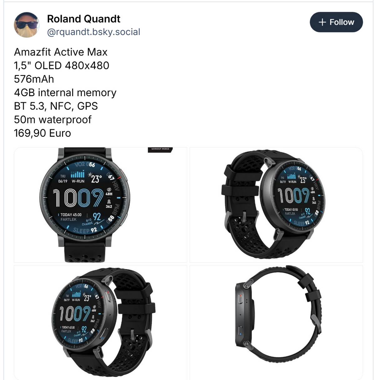 ‘어메이즈핏 액티브 맥스’는 유럽에서 약 170유로에 출시될 것으로 전망되며, 이는 액티브 2보다 약 40유로 인상된 가격이다. 정식 출시 일정은 아직 공개되지 않았다.