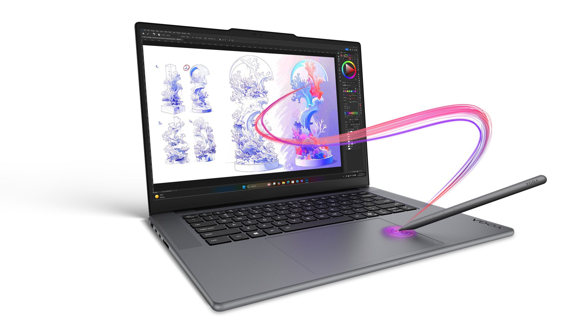 요가 프로 7i 아우라 에디션은 차세대 터치패드 ‘포스패드(Force Pad)’와 ‘요가 펜 2세대(Yoga Pen Gen 2)’를 통해 한층 정교하고 직관적인 작업 환경을 제공한다. 포스패드는 스마트 센서를 기반으로 즉시 드로잉 패드로 전환돼 별도의 장비 없이도 정밀한 작업이 가능하다. 와콤(Wacom) AES 3.0 수준의 기술이 적용된 요가 펜 2세대는 4,096단계 필압과 부드러운 필기감을 바탕으로 스케치부터 디자인, 아이디어 구현까지 크리에이티브 작업 전반을 지원한다.