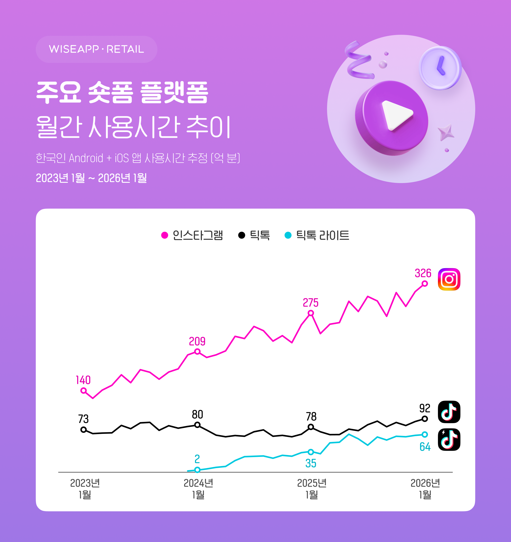 와이즈앱·리테일이 한국인 스마트폰 사용자(Android + iOS)를 표본 조사한 결과, 최근 3년간 숏폼형 SNS 플랫폼인 인스타그램(Instagram), 틱톡(TikTok), 틱톡 라이트(TikTok Lite) 앱의 월간 사용자 수는 꾸준히 증가했다. 2026년 1월 기준 각각 2,797만 명, 943만 명, 707만 명을 기록했으며, 이는 각 앱 출시 이후 역대 최대치다.