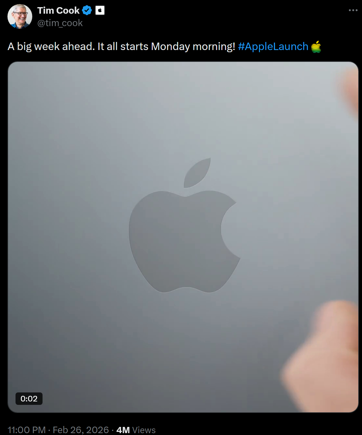 외신에 따르면 팀 쿡 CEO는 26일 자신의 X(구 트위터)를 통해 “월요일 아침, 모든 것이 시작된다”고 언급하며 기대감을 끌어올렸다. 이번 발표는 전통적인 키노트 형식 대신, 며칠에 걸쳐 보도자료로 제품을 순차 공개한 뒤 3월 4일 뉴욕•런던•상하이에서 미디어 대상 ‘애플 익스피리언스’ 체험 행사를 여는 새로운 방식으로 진행될 것으로 전해졌다.