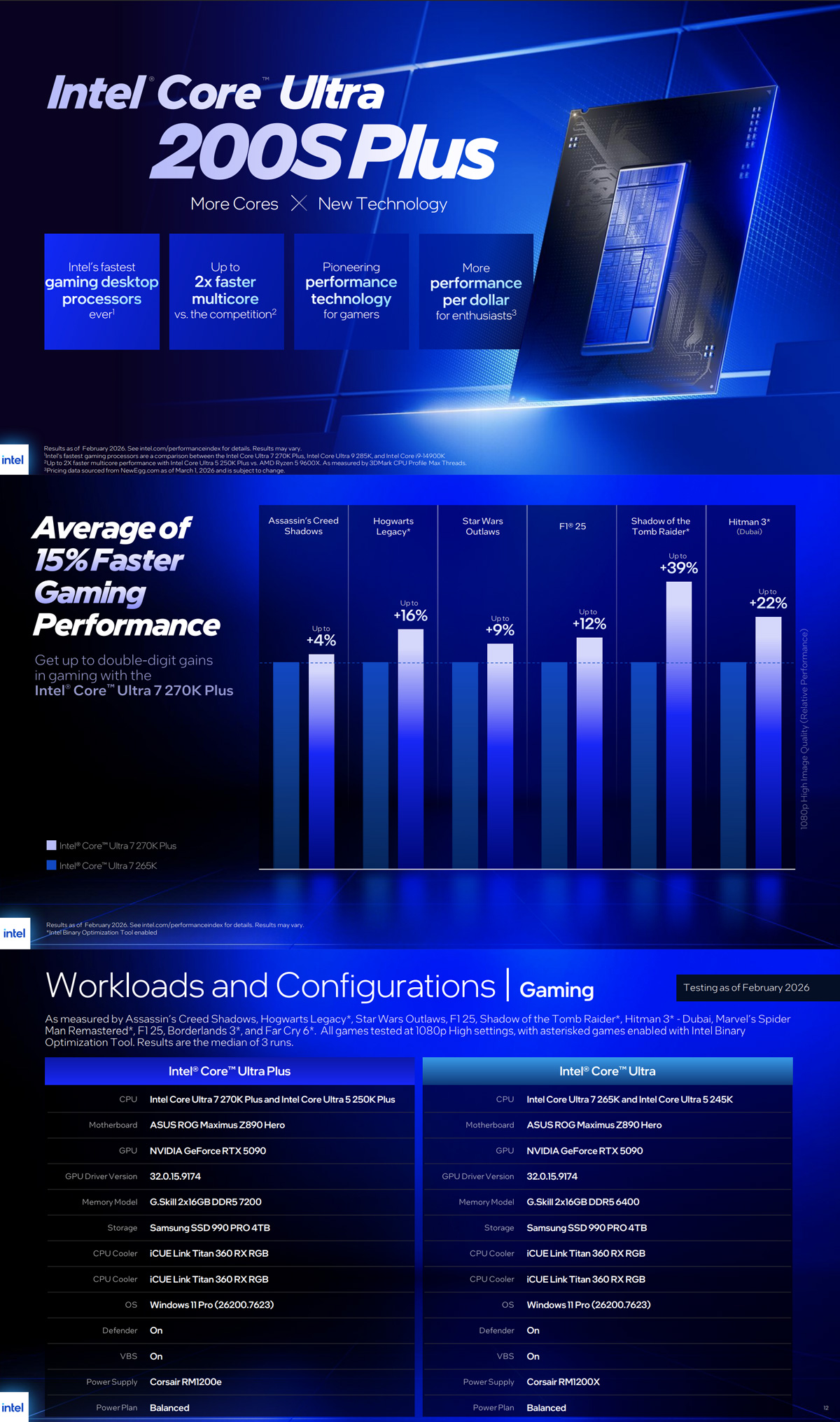 인텔이 코어 울트라 200S 플러스 시리즈를 발표하며, 기존 모델 대비 15% 게임 성능 향상과 가격 인하를 강조했다.