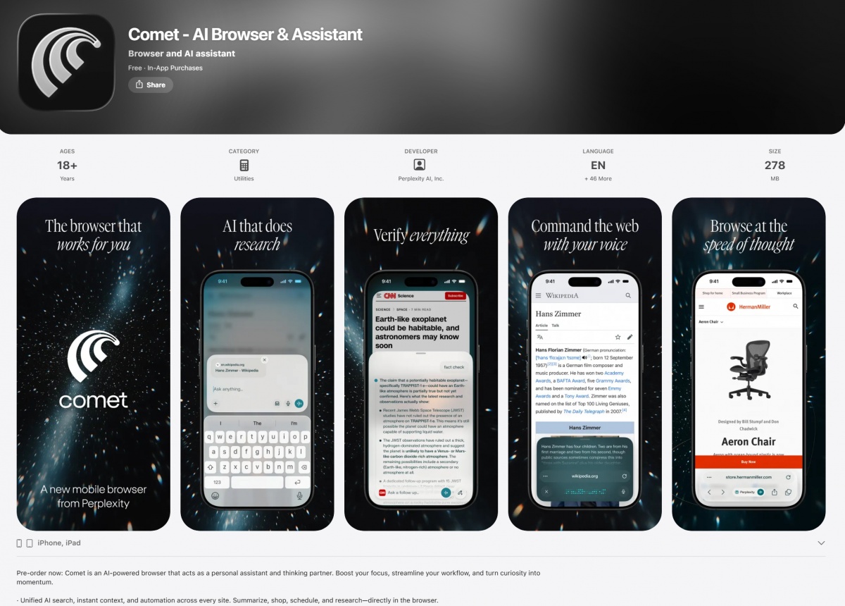 퍼플렉시티(Perplexity)의 AI 기반 웹 브라우저 ‘코멧(Comet)’이 데스크톱과 안드로이드에 이어 iOS 버전으로 출시됐다.