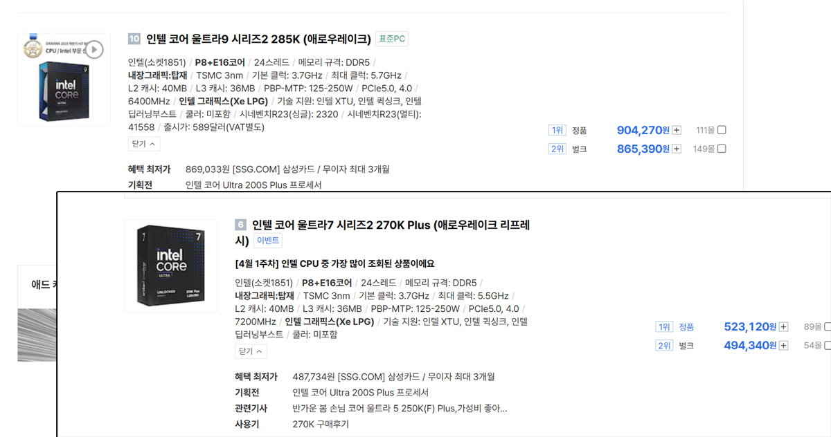여기에 기존 코어 울트라 7 265K와의 가격 차이는 약 20달러 수준에 그친다. 큰 부담 없이 상위 모델에 준하는 구성을 선택할 수 있는 조건이 만들어진 셈이다.