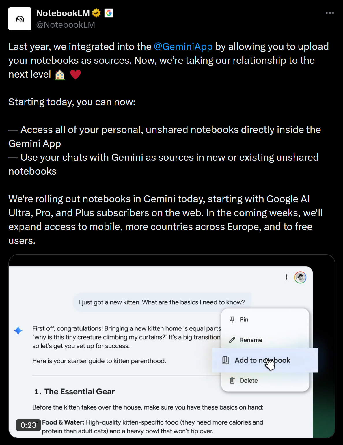 구글 제미나이에 노트북LM 동기화 기능이 추가되어, 대화 내용과 웹 자료를 주제별로 관리하고 재가공할 수 있게 되었다. 무료 사용자는 노트북당 최대 50개의 소스를 저장할 수 있다.